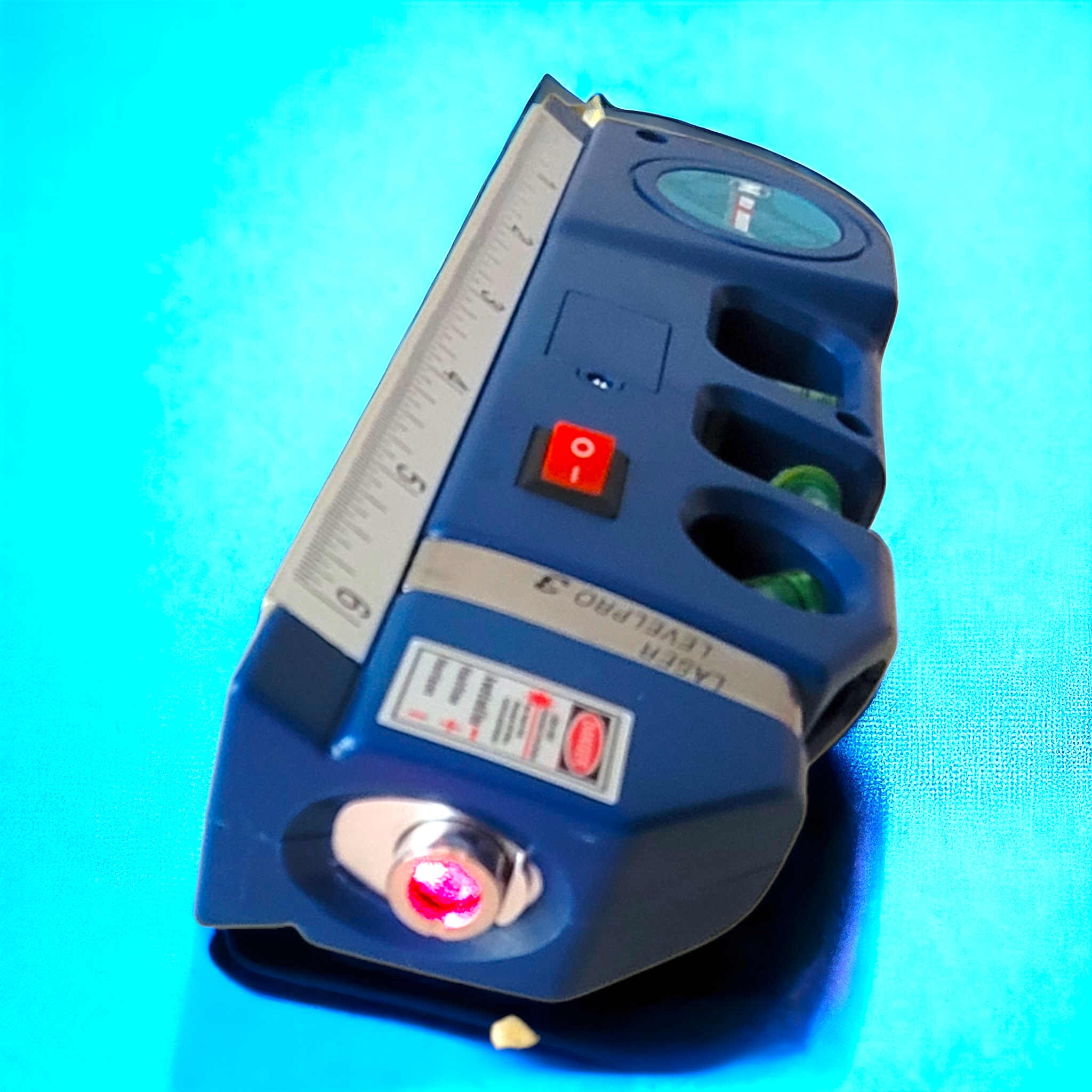 Пузырьковый уровень имеет 3 ярких салатовых глазка, металлическая рулетка встроенная в конструкцию выдвигается на 250 см. Прибор создан из алюминия и покрашен в красный/синий цвет. Основание имеет металлическую линейку 15 см.